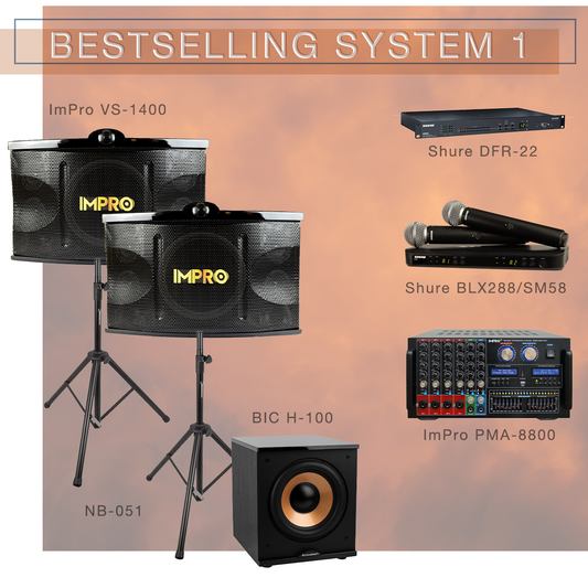 Best Selling System 1 Karaoke Package with ImPro Speakers with Stands, Mixing Amplifier and Shure Microphones
