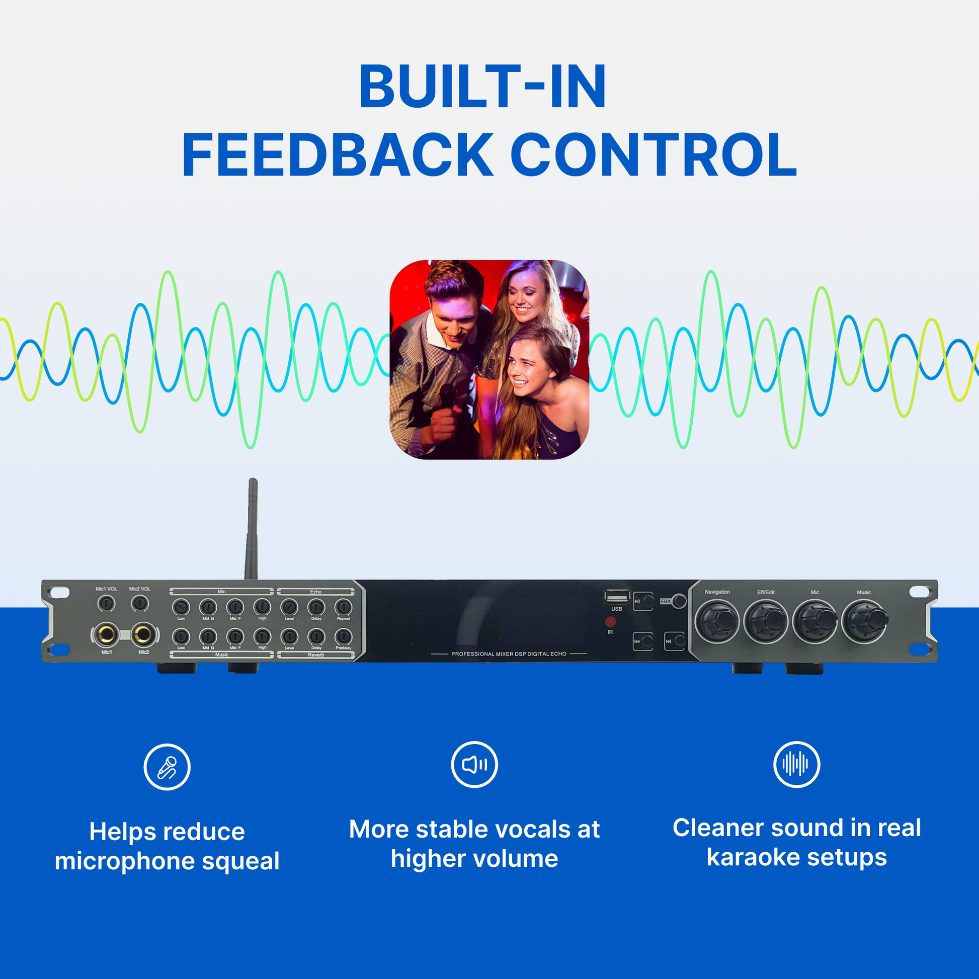 The MX-9 is tuned for karaoke-style vocal processing: dial in Echo (Level/Delay/Repeat) and Reverb (Level/Delay/Pre-Delay) to get that "finished" vocal sound, while FBX helps reduce the harsh feedback that can happen when the room gets loud.