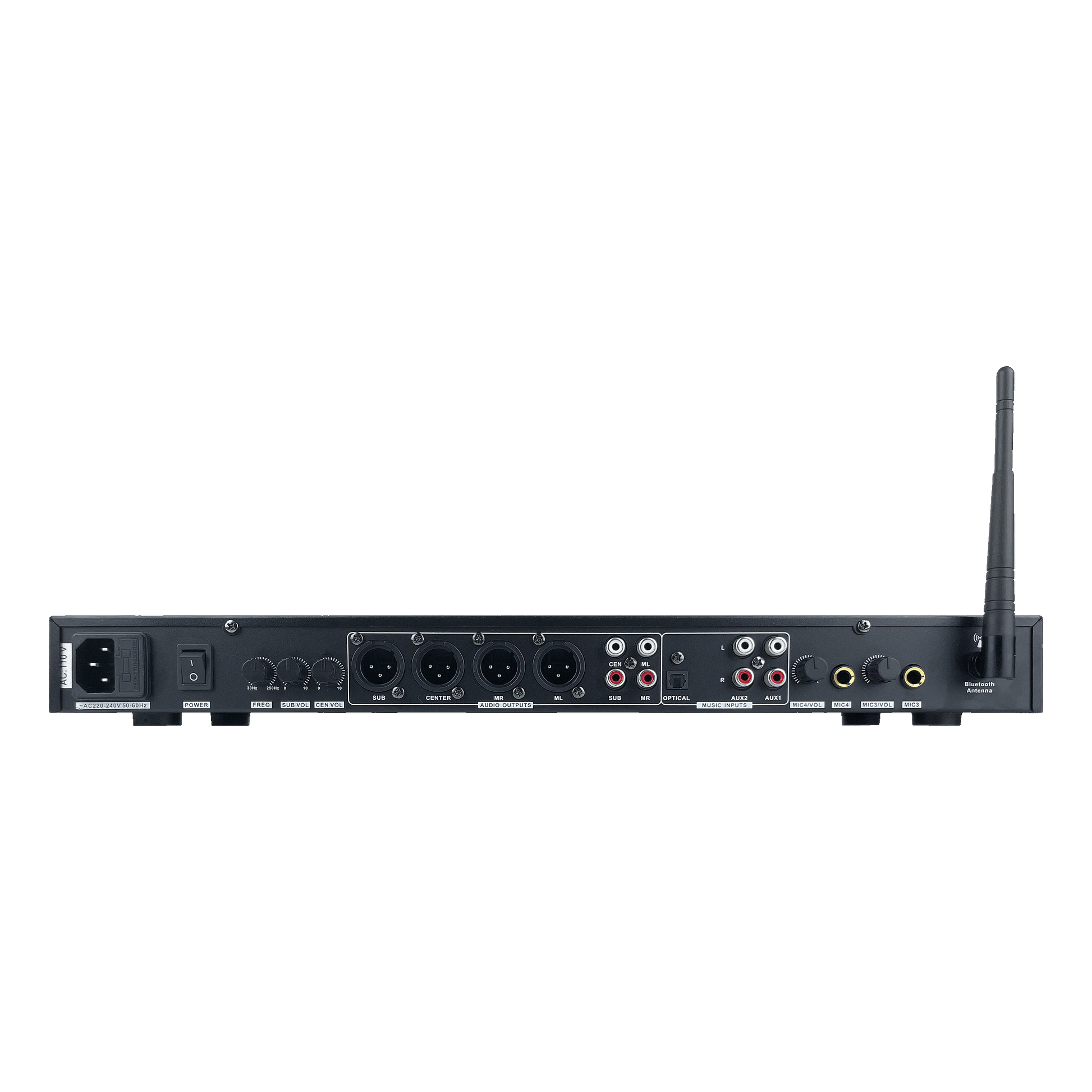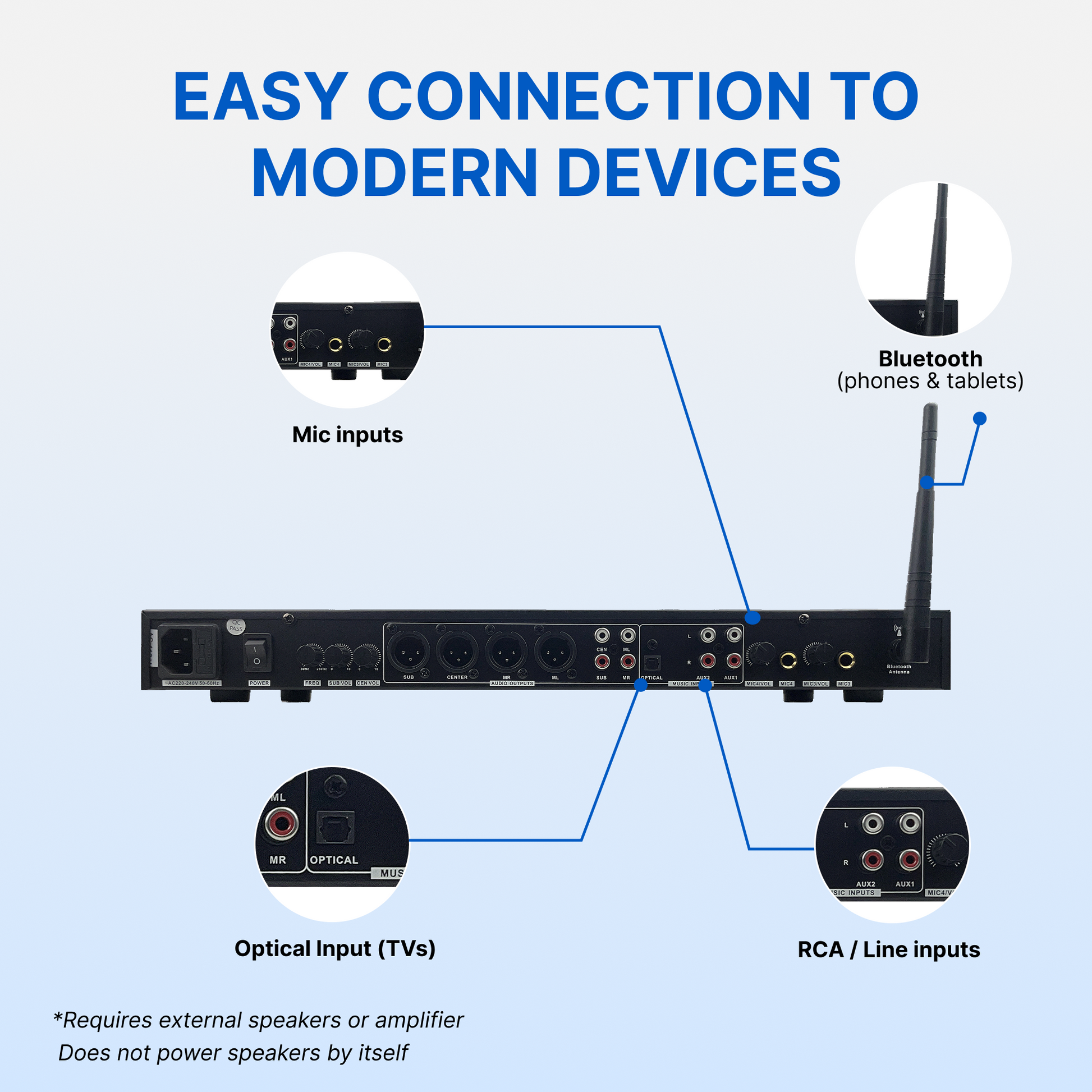 - 4 Mic Inputs: Connect up to four microphones (2 front + 2 rear)