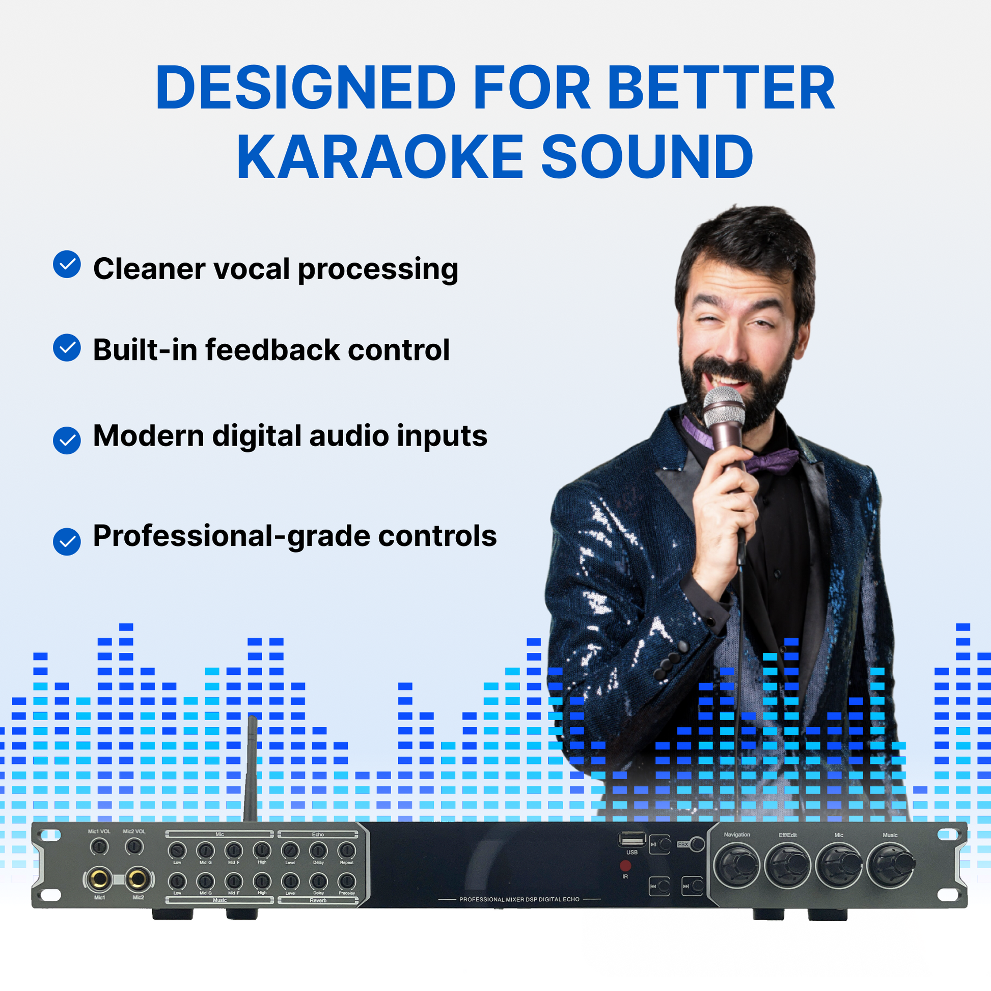 - DSP Vocal Effects: Digital echo + reverb controls for a polished karaoke vocal
