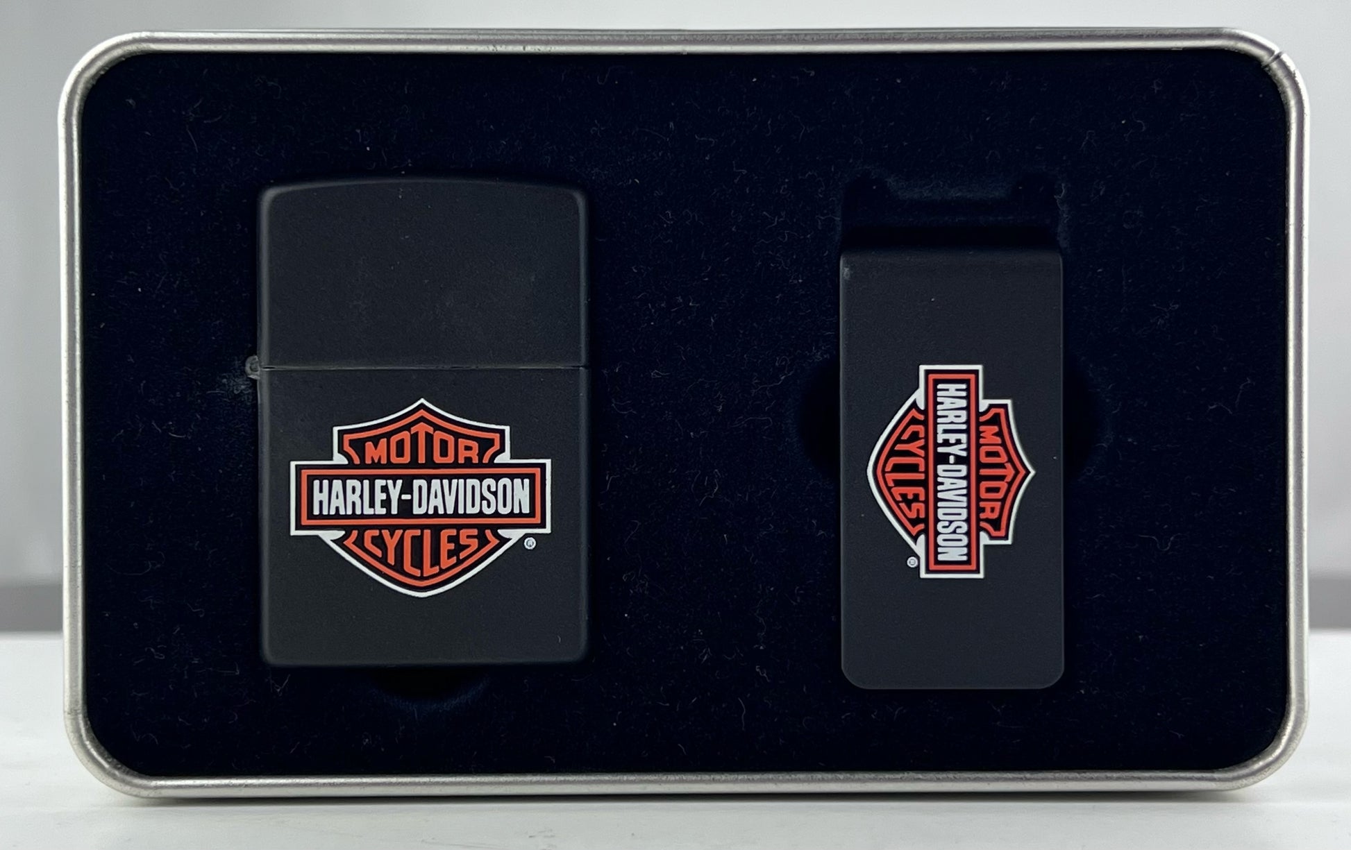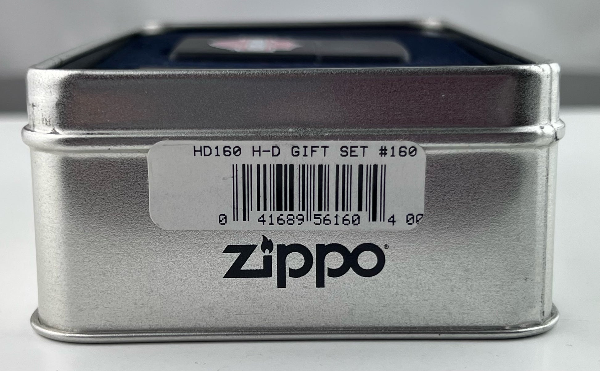 Zippo Harley Davidson Lighter & Money Clip Gift Set #160. New in Tin Box. Flints disintegrate over the years so be prepared to add a new flint if the item you are purchasing is over 10 years old.
